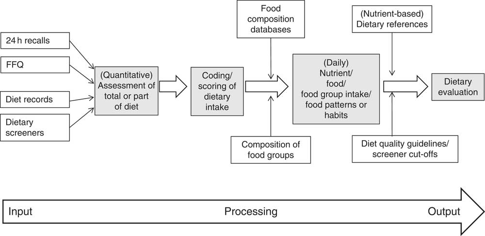 Dietary assessment may be described as the science and art of evaluating the dietary intake of individuals or groups for research or as basis for nutrition care( Reference McCabe-Sellers 1 ). While screening and comprehensive assessments have been differentiated( Reference Correira 2 ), both are characterised by phases of varying detail. Data collection and data evaluation are respectively the beginning (input) and endpoint (output). The aim of a particular dietary evaluation will determine the most appropriate tools and techniques in each phase. Using technology should improve at least the efficiency and ideally also the quality of dietary assessments, which are known to be labour-intensive and threatened by concerns about validity( Reference Dhurandhar, Schoeller and Brown 3 ). Many reviews about the use of technology in dietary assessment have been published( Reference Arens-Volland, Spassova and Bohn 4 – Reference Thompson, Subar and Loria 15 ). The current invited commentary aims to place these technologies into the context of dietary assessment viewed as a system.