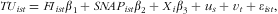 where TUist represents the time households spend in the four food-related activities described above, where the household is represented by i in state s in year t; FIist represents household food insecurity; SNAPist represents SNAP participation or benefit level; Xi represents household demographics included in the model; us represents state fixed effects; and vt represents year fixed effects. ɛist represents the error term that captures unobservable determinants of time spent in each food-related activity. Because previous research has indicated that married and single households allocate time differently, we estimate these households separately( Reference Crossley and Lu 11 ). These models are estimated using ordinary least squares.