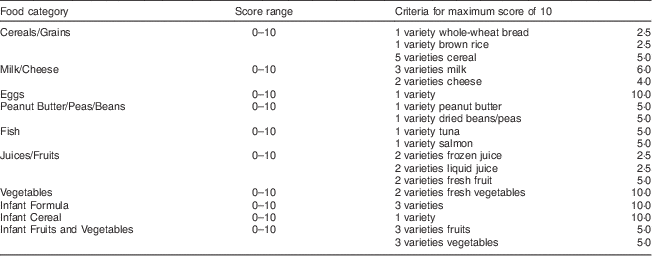 The WIC-AI was developed from the in-store survey as a summary score to assess the availability of all WIC foods. The WIC-AI was modelled on the Healthy Eating Index with total points ranging from 0 to 100 and encompassing ten different components( Reference Kennedy, Ohls and Carlson 35 , Reference Guenther, Reedy and Krebs-Smith 36 ). The WIC-AI components and score are detailed in Table 1. Each of the ten components represents a category of WIC food package item (milk, grains, fruits, vegetables, etc.) and has a component score between 0 and 10. In defining the ten categories we attempted to develop a balanced index that would reflect weighting across dietary needs aligned with the US Department of Agriculture’s Choose My Plate( 37 ) and Dietary Guidelines for Americans( 38 ) but also maintain enough disaggregation to represent the challenges at the retail level of carrying all these foods. For example, cereals and grains were grouped into one category as were milks and cheeses for nutrition reasons, but eggs, legumes and fish were categorized separately because of the different implications for supplying to and carrying in a store. This is particularly important to consider when applied to small food stores.