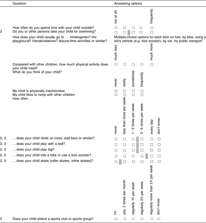 Children's PA was assessed using twelve items in a parental questionnaire, including five from a pre-existing PA assessment tool(Reference Bayer, Bolte and Morlock26) and seven additional items capturing everyday PA of the children (see Table 1). The answers to most items were given on a 5-point ordinal rating scale providing an additional ‘do not know’ option. Two items were rated on a 4-point scale. When asked for habits, parents were instructed to think of the last typical week. The questionnaires were distributed to the parents by the pre-school teachers at the onset of accelerometer recording and were collected 6 d later.