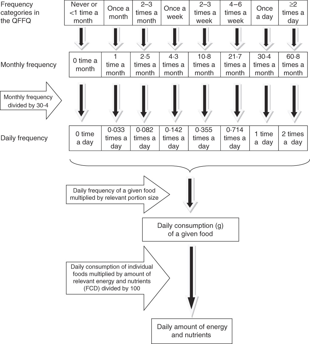 Daily intake of each food item was determined for each subject. The frequency categories in the QFFQ were converted to monthly frequencies (Fig. 1). For each seasonal food, the monthly frequencies were adjusted by multiplying the proportion of months per year for which the food item was available.