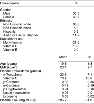 Table 1 Demographic characteristics and plasma antioxidant concentrations: college students aged 18–25 years who completed a 30 d FR and two FFQ (n 60), Connecticut, USA