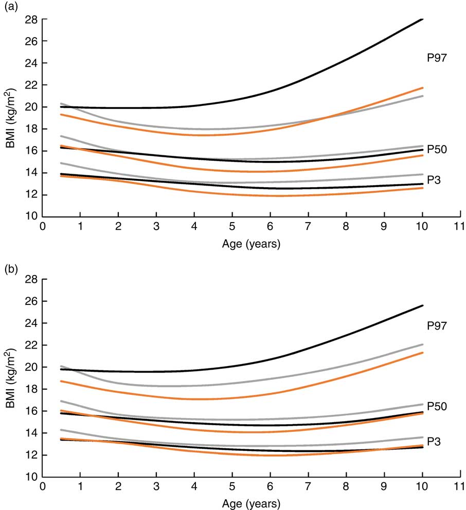 Fig. 1 BMI-for-age percentiles for boys (a) and girls (b), according to WHO( Reference de Onis, Martinez-Costa and Nunez 1 ) (