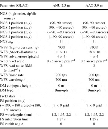 The input configuration parameters for the GLAO model, as used for the ANU 2.3-m and AAT 3.9-m telescopes, are tabulated in Table 5.