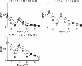 Figure 4. yao numerical SCAO simulation Strehl results for field stars having mR = 15 and angular distance from LGS (x, y) in arcsec of (0, 0) (asterisks), (0, 10) (open circles), and (20, 20) (open squares) for the ANU 2.3-m telescope with the SSO model-OTP (1–9). This simulation models anisoplanatism (correction FOV) performance for wavelength bands J, H, and K.