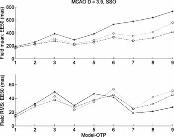 Figure 7. MCAO simulation results summary (using yao) for the EE50d parameter (units of mas) for field mean and field RMS at the J-band (asterisks), H-band (open circles), and K-band (open squares) wavelengths for the AAT 3.9-m telescope with the SSO model-OTP (1–9).