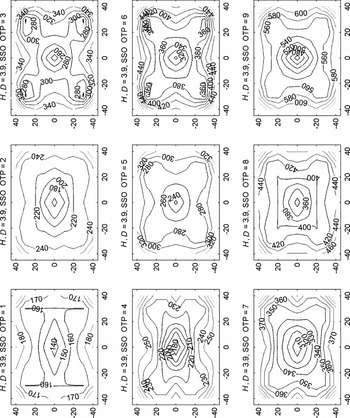 From Figures 6 and 7 we note similar trends in the MCAO performance of both telescopes. The results for MCAO simulations for SSO having an FOV of 80 arcsec show sensitivity to the ground-layer turbulence with the poorest EE50d results for ‘bad’ ground-layer conditions (poorest seeing), particularly for the shortest wavelength or the J band. Reasonable MCAO results for SSO are achievable for longer wavelengths of the H and K bands, with the field mean of EE50d between 200 and 400 mas and corresponding field RMS between 20 and 50 mas. Conditions of strong free-atmosphere turbulence (model atmospheres 3, 6, and 9) increase both the mean and RMS of EE50d, but the MCAO sensitivity to the free atmosphere is somewhat less than that for the SCAO performances. The EE50d contour plot shown in Figure 10 for bad free-atmosphere conditions shows the best corrections around the placement of the five LGS (hence large field RMS of EE50d).