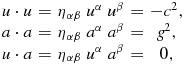 u \cdot a &=& \eta _{\alpha \beta }\ u^\alpha \ a^\beta &=& 0, \end{array}
