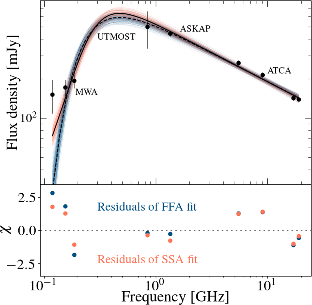). A turnover in the radio spectrum is sometimes observed (e.g., Miller-Jones et al. Reference Miller-Jones, Blundell, Rupen, Mioduszewski, Duffy and Beasley2004; Chandra & Kanekar Reference Chandra and Kanekar2017), which moves to lower frequencies as the emitting region expands (van der Laan Reference van der Laan1966). Such a spectral turnover could either be caused by synchrotron self-absorption (SSA), or by free-free absorption (FFA) by thermal plasma (see Gregory & Seaquist Reference Gregory and Seaquist1974; Miller-Jones et al. Reference Miller-Jones, Blundell, Rupen, Mioduszewski, Duffy and Beasley2004, and references therein). In the case of SSA, the physical parameters of the jet set the turnover frequency, which scales with the magnetic field strength and the radius of the emitting region.