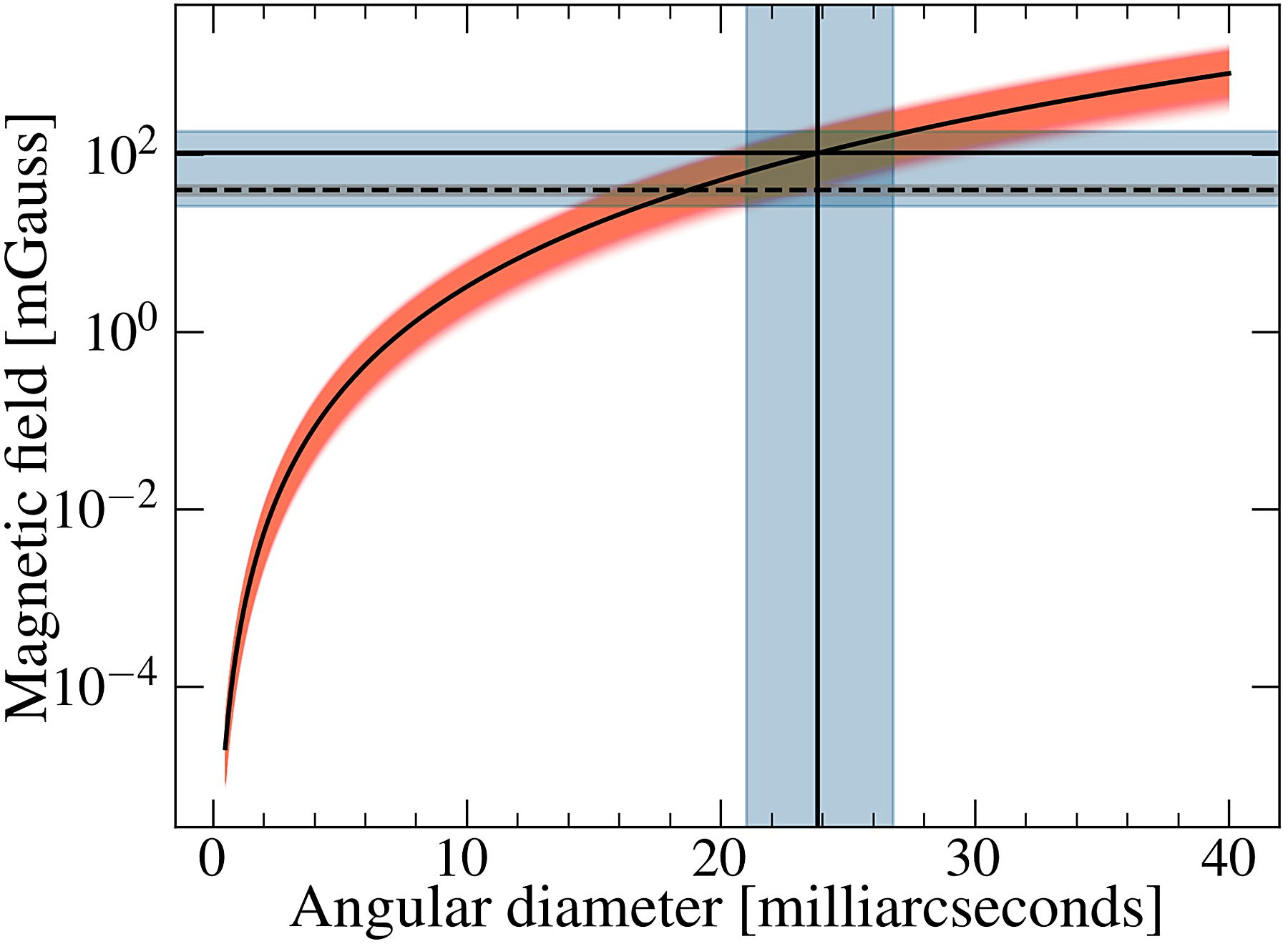 mG) corresponding to the inferred source size. The shaded regions across all the horizontal and vertical lines indicate the