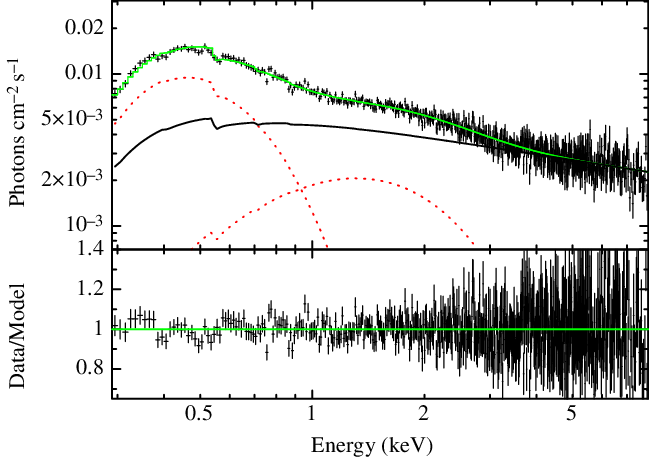 Figure 2. Time-averaged Swift/XRT spectrum of Mrk 509 and best-fit model (green line) are shown along with individual spectral components (red dotted lines for two blackbody components and solid black line for the power law continuum model) in the top panel. Corresponding residuals are shown in the bottom panel.