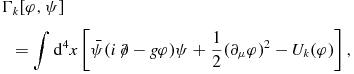 (2) $$\begin{eqnarray} && \Gamma _k[\varphi ,\psi ] \nonumber\\ &&\quad = \int {\mathrm{d}} ^4x\left[\bar{\psi }(i\mbox{ {$\partial $}\hspace*{-7pt} {$\slash $}} - g\varphi )\psi + \frac{1}{2} (\partial _\mu \varphi )^2 - U_k(\varphi )\right], \end{eqnarray}$$