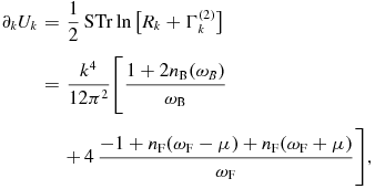 (3) $$\begin{eqnarray} \partial _{k} U_{k} & = & \frac{1}{2} \mathop {\mathrm{STr}} \ln \left[R_k + \Gamma _k^{(2)} \right] \nonumber\\ & = & \frac{k^{4}}{12\pi ^{2}} \bigg[ \frac{1+2 n_{\text{B}}(\omega _B)}{\omega _{\text{B}}} \nonumber\\ &&+\, 4\,\frac{-1+n_{\text{F}}(\omega _{\text{F}}-\mu )+n_{\text{F}}(\omega _{\text{F}}+\mu )}{\omega _{\text{F}}}\bigg] , \end{eqnarray}$$