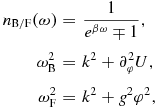 (4) $$\begin{eqnarray} n_{\text{B}/\text{F}}(\omega ) &=& \frac{1}{e^{\beta \omega }\mp 1}, \nonumber\\ \omega _{\text{B}}^{2} & = & k^2 +\partial _{\varphi}^{2} U, \nonumber \\ \omega _{\text{F}}^{2} & = & k^2 +g^2\varphi ^{2}, \end{eqnarray}$$