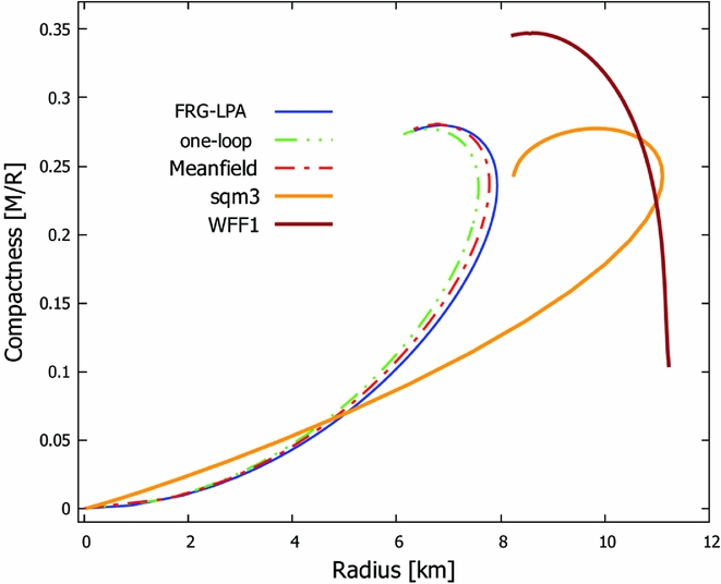 Merging compact stars are also predicted sources of gravitational waves (Rezzolla & Takami Reference Rezzolla and Takami2016). The form of the emitted gravitational waves strongly depends on the compactness of the neutron stars, which is defined as C = M/R (Hinderer et al. Reference Hinderer, Lackey, Lang and Read2010). We calculated here how the compactness is related to the mass and the radius of the neutron star in our toy model to study the effect of quantum fluctuations. We compared our model to some other EoS taken from Ozel et al. (Reference Ozel, Psaltis, Guver, Baym, Heinke and Guillot2016a), which are typically used in compact star models. The physical quantities are calculated in different levels of approximation: the mean-field level which contains no quantum effects, the one-loop level which is the lowest order approximation for quantum effects, and the high-order FRG–LPA approximation, which is the most accurate from these ones.