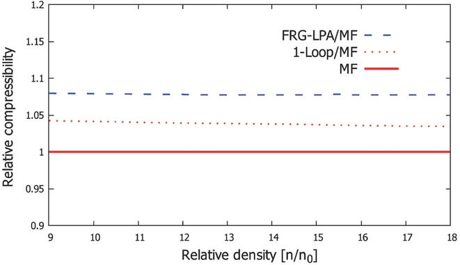 For this reason in Figure 3, we show the relative compressibility compared to the mean-field calculation, which constraints no quantum effects. The high-order FRG calculation (dashed line) is the most accurate and it is approximately 8% higher than the mean-field result. The one-loop calculation, which considers quantum fluctuations at the lowest order (dotted line) is about 3–4% higher than the reference mean field one. Figure 3 shows that the first-order approximation is not satisfying for the purposes of calculating the compressibility.