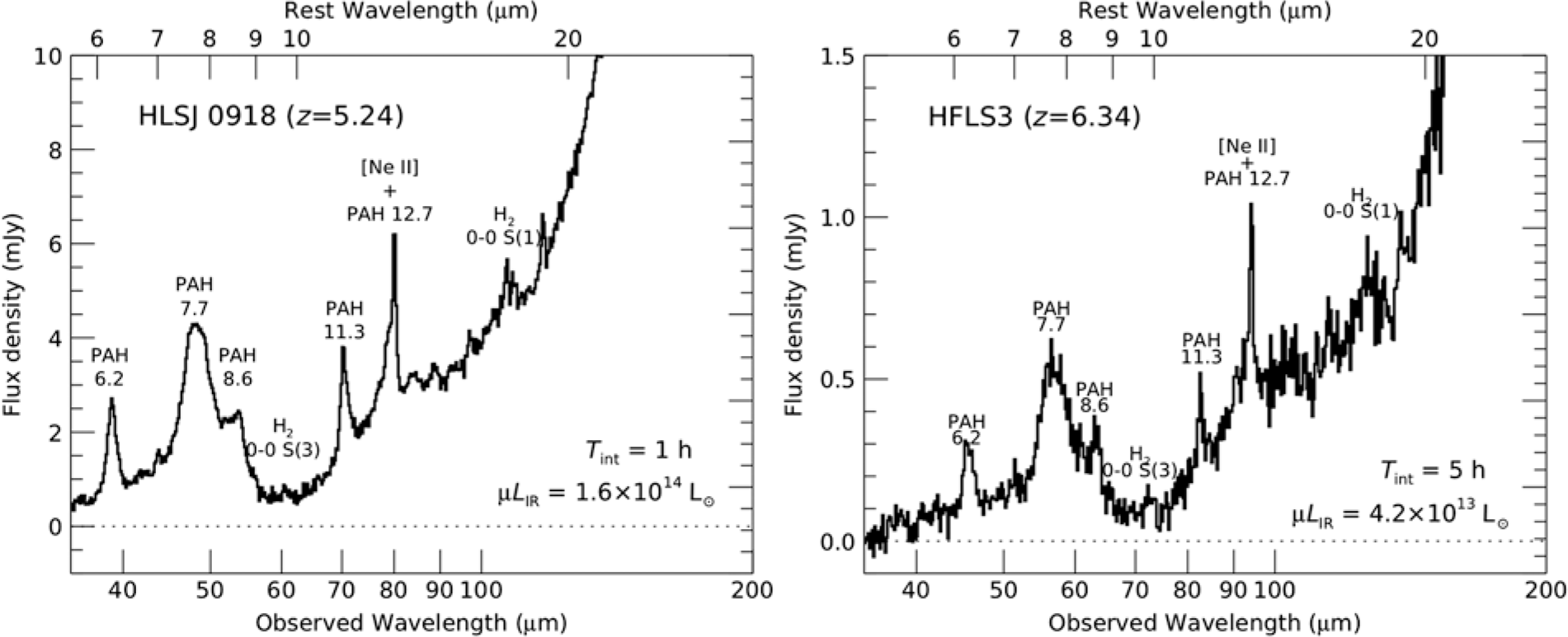 Figure 1. Simulated SAFARI spectra of HLSJ0918 (z = 5.24, μ = 9: Combes et al. Reference Combes2012; Rawle et al. Reference Rawle2014) and HFLS3 (z = 6.34, μ = 2: Riechers et al. Reference Riechers2013; Cooray et al. Reference Cooray2014) are shown in the left and right panels, respectively. The average local galaxy SED templates (Rieke et al. Reference Rieke, Alonso-Herrero, Weiner, Pérez-González, Blaylock, Donley and Marcillac2009) of L IR = 1011.75 and 1012.50 L⊙ were used, respectively, which produce good fits to the observed rest-frame far-infrared SEDs of these galaxies. The template SEDs were first scaled to the infrared luminosities without a lensing correction (μ L IR in each panel) and then fit with PAHFIT (Smith et al. Reference Smith2007) with a pixel sampling of R = 600. These PAHFIT-produced model spectra were then redshifted and noise-added for corresponding integration times (T int in each panel). Finally, the resultant spectra were resampled with R = 300 pixels. However, the effective resolution of these simulated spectra is less than R = 300 due to the low resolution (R ≈ 60–130) of the Spitzer/IRS data used by Rieke et al. (Reference Rieke, Alonso-Herrero, Weiner, Pérez-González, Blaylock, Donley and Marcillac2009) to build templates. Note that the actual mid-infrared spectra of these z > 5 galaxies may significantly differ from those of local LIRGs/ULIRGs (see Section 2.4 for more discussion).