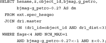 Taking the mean difference as indicating no variability, we search for objects with a brightness decline of more than 1 mag by selecting for B J − g petro − 0.27 < −1 using the query:
