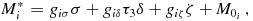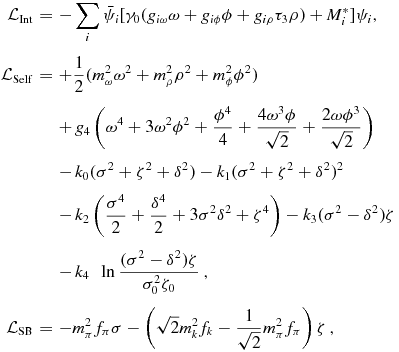 \mathcal {L}_{\rm {Int}}&=&-\sum _i \bar{\psi _i}[\gamma _0(g_{i\omega }\omega +g_{i\phi }\phi +g_{i\rho }\tau _3\rho )+M_i^*]\psi _i,\nonumber \\