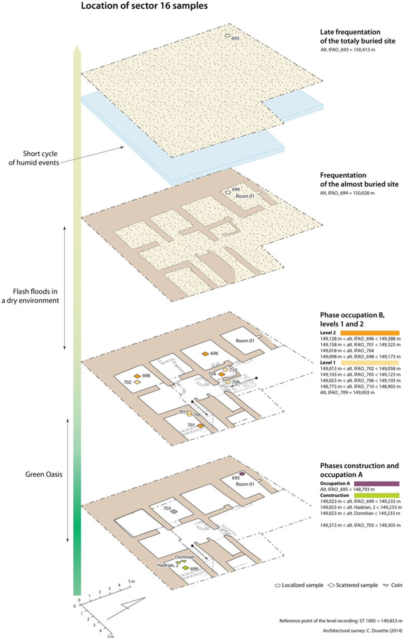 This final model shows that Qasr ‘Allam was occupied from the Third Intermediate Period to Roman times. In Period IV, with which the building’s occupation in Sector 16 is associated, the transition towards a dryer environment is set between 133 and 214 CE (2σ), which is clearly consistent with the first modeled range (132–216 CE, 2σ, Table 4). This confirms that environmental degradation occurred during the second half of the 2nd century CE. This upgraded model also provides a more constrained range for the occupation of this building, which lasted less than 60 years. Modeled determinations for the oldest periods are not extremely accurate because of the lack of radiocarbon determinations associated with these periods. In particular Periods I to III are not a posteriori modeled as continuous Phases, even though they actually were. The model would benefit from integrating more radiocarbon dates, but this could not be achieved at this stage. Additionally, the hiatus length during which flash floods occurred in the dry period lasted 125 years at the most. During this period of hyperaridity, the stratigraphy of room 001 recorded only 2 major rain events (flash floods that can erode mudbrick superstructures), clearly identifiable through silty clay deposits included in the layer of coarse sand, and about 4 less-heavy rains that have caused more diffuse deposits.