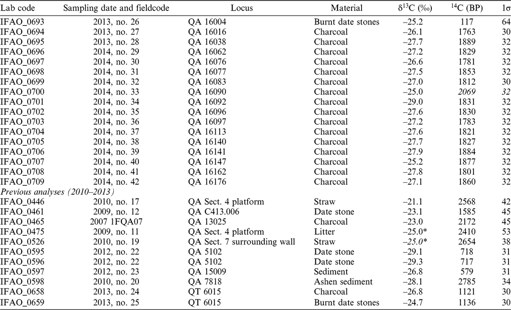The samples on which this study is based were collected during two sampling phases. Some dates were obtained from samples taken during the launch phase of the radiocarbon laboratory: 1 sample in 2007, 2 in 2009, 3 in 2010, 3 in 2012, and 5 in 2013 (Tables 1, 2, and 3). A more systematic sampling campaign (14 samples) was carried out in 2014 as part of a project funded by the CNRS Interdisciplinary Mission and the French national network of Maisons des Sciences de l’Homme (ChronoClim project). The strategy of this project was to first date the end of the transition process towards aridity more precisely, by focusing on archaeological contexts linked to that particular juncture. The study of this period was made possible by a geophysical survey that led to the discovery of Roman buildings in Sector 16 (Gavazzi et al. Reference Gavazzi, Alkhatib-Alkontar, Munschy, Colin and Duvette2017). The second phase of the fieldwork should have consisted in establishing the beginning of the wetter period by studying older archaeological layers and geological outcrops. This proved impossible because of deadly attacks in the area of the Farafra/Bahariya oases a few days after our last mission in 2014. The rarer datings of earlier contexts that we obtained in the previous years will nevertheless also be presented in this article, but, for the most part, due to these circumstances, we will focus on the wet/dry transition process in Roman times.