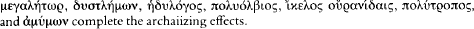 9 A number of Aeolic and Ionic features are found in Filelfo's Greek poems. Final vowels in prepositions may be dropped (apocope). The Ionic ov as in μoῠvo ς, and ɛɩ as in ζɛίvo ς, and ηɛ as in ᾐέƛɷς, are found respectively for o , ɛ, and η. Whereas in other Greek poetry α, ɛ, and o are elided, here as in Homer the terminal dipthongs αɩ and oɩ are also elided. The oɩ in personal pronouns may also be elided. Consonants may be written singly or doubled to suit the metre, as in őơơov or ooaov. Homeric endings for the genitive singular and the genitive plural may be found:-oɷ, -ɛɷ, and -άɷv . Homeric prepositional suffixes also occur: - θɛv, -ơɛ, and θɩ. The Homeric pronouns ἄ μμɛζ, ἄ μμɩv, σɛῖo, σɛo, and the dative oὶ are characteristic features of the poems.The temporal augment in the imperfect and aorist tenses is omitted freely. Uncontractedforms, particularly in the case of contract verbs, are the rule rather than the exception,as for example ϕɩƛέεɩ, ϰέεɩ, ἅν or ϰε is frequently omitted where Attic would have it. Some epic forms of the verb to be occur: εἶς, ἐών, ἔσαν. Finally, the use of typically Homeric or Homeric-style epithets, such as ;μεγ αƛώ&n u;ʋμ ç,μεγαƛóϕϱω,