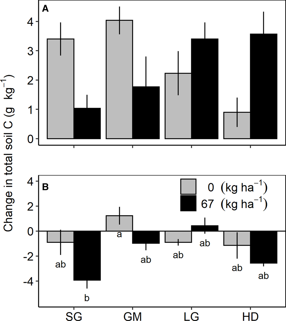 Fig. 2. Change in total soil carbon (C) from 2013 to 2017 in the 0–15 cm (A) and 30–60 cm (B) soil profiles in the fertilized (67 kg N ha−1) and unfertilized (0 kg N ha−1) switchgrass (SG), four-species grass mixture (GM), eight-species legume–grass mixture (LG) and the 12-species high-diversity mixture (HD) at Becker, Minnesota.