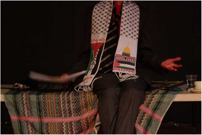 The 2006 elections, and the external response to Hamas acted as a turning point in Palestinian politics, marking a distinct shift in the levels and forms of violence waged against the Palestinians by the Israeli occupying forces, supported by European and American policies and practices. Both European and Palestinian observers argued that Hamas should have at least been given an opportunity to govern under as normal conditions as possible, and be voted out under democratic process should it fail.Footnote 29 The demand to know Hamas as already a terrorist and the ritualisation of EU institutional and discursive practices closed down such an opportunity.Footnote 30 I suggest that performance art presents an opportunity to revisit this turning point. In the theatre space or the imaginative space new political initiatives can be experimented with, and new political subjectivities can be performed.