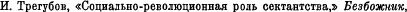 14 (), I, 382-84. He described these and other instances of sectarian help in () (Moscow, 1924), pp. 22-40. Such acknowledgments do not seem to have been rare in the early twenties, but by the late twenties writers were denying that the sectarians had ever helped the Bolsheviks with a heat far surpassing the bounds of a mere polemic. For example, the Tolstoyan I. Tregubov (in (), Dec. 6, 1925, p. 2)— referring to an earlier article in (), Jan. 24, 1924—claimed that when the Bolsheviks had not been able to print () because of the Provisional Government's interference, they had taken () to the publishing house Slova Istiny, run by Baptists. Tregubov's opponent's most coherent argument was that not all the workers had been sectarians—and besides, they had overcharged. See () (Moscow, 1928).