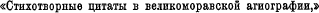58 Cf. the interesting reconstruction in R. Burgi, A History of the Russian Hexameter (Hamden, 1954), p p . 5-9 (suggestion ad p. 9: in the Archive Manuscript, read Zakona gradiska [instead of grantska] glavy. This will introduce the more plausible “Civil Law” [nomos politikos] and will eliminate t h e “Law of Verse” a n d t h e postulated but otherwise unknown Old Church Slavonic treatise o n versification). N. S. Trubetzkoy, “Ein altkirchenslavisches Gedicht,” Zeitschrift für slavische Philologie, XI (1934), 52-54, has postulated that the praise of St. Gregory of Nazianzus contained in Vita Constantini, § 3 (Lehr- Splawinski, p. 9) is a poem, and obtained (by slightly changing the text) a seven-line structure of seventeen or sixteen syllables each (the sequence being 17, 16, 16, 17, 16, 16, 17) with a caesura after the fifth or seventh syllable, a n d with the last syllable of a line always unstressed. When, for the sake of comparison, we take an early tenth-century Byzantine inscription, i n hexameters, which happens to be seven lines long, we find that its verses have 17, 16, 16, 17, 17, 17, 16 syllables respectively, that the penthemimeres caesura (or rather, in P. Maas’ terminology, the Binnenschluss, always coinciding with the end of the word) stands after the seventh syllable in four out of seven cases, and that the final syllable is never under stress. For the text of the inscription, cf. A. M. Schneider, Jahrbuch des deutschen archdologischen Instituts, Archäologischer Anzeiger 1944/45 (1949), p . 78. I am leaving it u p to the specialists to evaluate this juxtaposition. A. Vaillant, Revue des études slaves, XIV (1934), 236, considers the praise of Gregory of Nazianzus to be in prose.