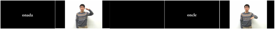 In the vocabulary training session, participants were asked to learn 12 words. The vocabulary training video contained a total of six units each containing minimal pair words, which were presented in three consecutive blocks with the stimuli in different orders. In total, they listened to the same stimuli three times. Within each unit, and for each of the word pairs, they were exposed to the following temporal sequence (see Figure 5): (a) the orthographic form of the Catalan word corresponding to the target Mandarin word to be learned; and (b) the video clip with the target word as produced by the instructor.