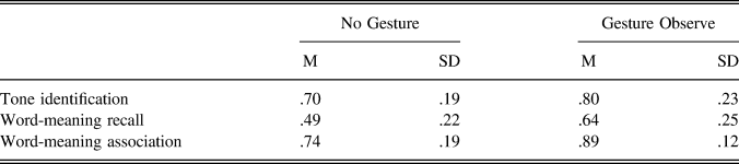 In sum, results of the tone identification task show that observing pitch gestures significantly improved tonal perceptual learning in participants without any prior knowledge of Mandarin Chinese. Similarly, results from the two word-learning tasks demonstrate that a short vocabulary training session in which they observe pitch gestures may enhance L2 students’ vocabulary learning in a tonal language like Chinese, at least at an initial stage of learning, and thus confirm the role of merely observing this specific type of gesture regarding the learning of words with tones.