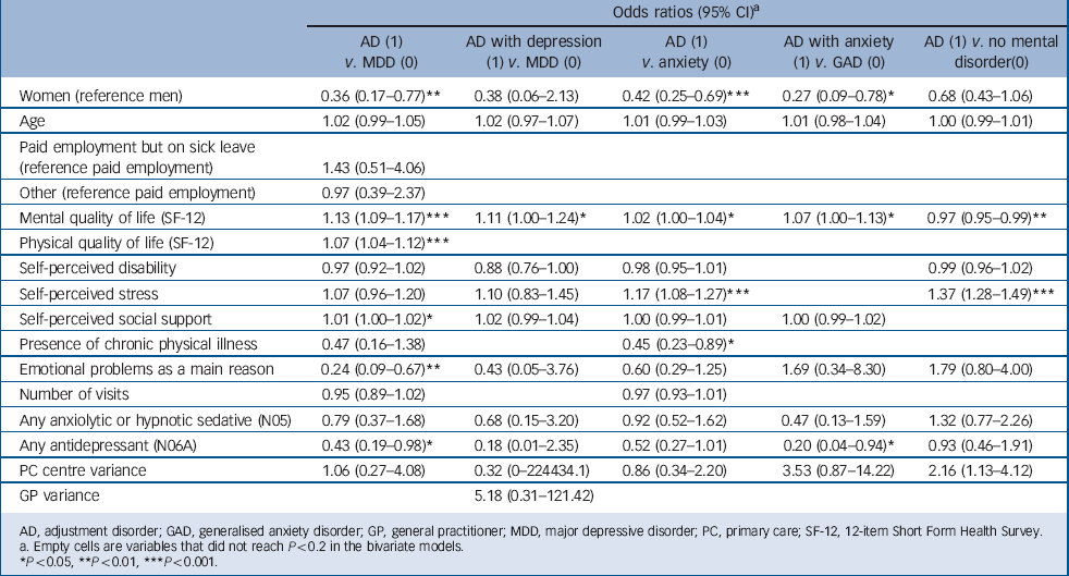 Table 2 shows the three final multivariate logistic models used to assess differences between adjustment disorder v. major depression; adjustment disorder v. anxiety disorder; adjustment disorder v. primary care patients with no mental disorder; adjustment disorder with depressive symptoms v. major depression; and adjustment disorder with anxiety symptoms v. generalised anxiety disorder.