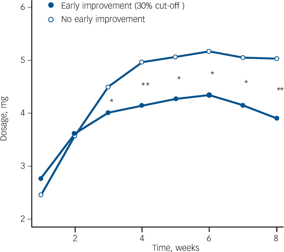 The confidence intervals of a 26–60% PANSS total score improvement to predict response and a 28–61% improvement to predict remission seem rather impractical. Therefore, we propose a 30–60% reduction as definition of early improvement, suggesting that a patient should improve by at least 30% in PANSS total score. The time course of the PANSS total score comparing patients with early improvement and those without early improvement (30% reduction) is shown in Fig. 3. Patients achieving this cut-off v. those not achieving it were further compared regarding the mean dosage of antipsychotic medication prescribed (Fig. 4). Patients with early improvement were significantly more likely to become responders (P<0.001) as well as remitters (P<0.01) compared with patients not achieving the 30% improvement. No significant difference was found in a comparison of the two subgroups in terms of duration of current hospital treatment (P = 0.72) and gender (P = 0.29). Patients with early improvement were found to be significantly older than patients not achieving early improvement (P<0.01).