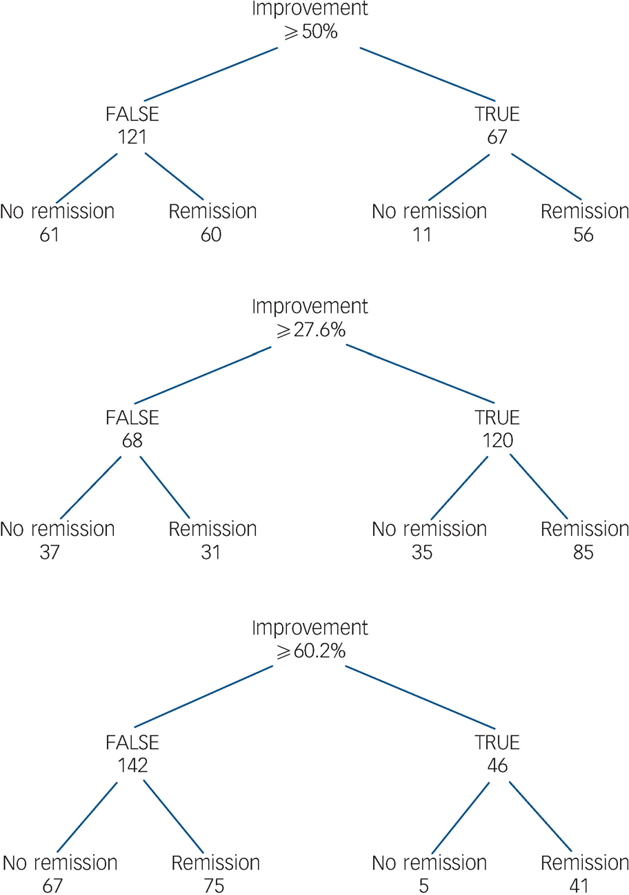 As mentioned above, since both 26% and 28% are impractical, we suggest instead an interval of 30–60%. Our results indicate that a patient with a first psychotic episode should achieve at least a 30% PANSS total score improvement after 2 weeks to best predict treatment response or remission. This empirically derived cut-off value is high compared with recently proposed cut-off values which usually rely on a 20% improvement. Reference Kinon, Chen, Scher-Svanum, Stauffer, Kollack-Walker and Sniadecki17,Reference Scher-Svanum, Nyhuis, Faries, Kinon, Baker and Shekhar32 In particular, the 60% improvement after two treatment weeks seems too strict at first glance, even for first-episode schizophrenia. However, in our study we found that 23% of the patients who had achieved a 60% PANSS total score improvement at week 2 were concurrently responders at week 8, and that 22% of the patients were in remission (see Figs 5 and 6). This suggests that a 60% improvement at week 2 predicting subsequent response and remission is not unrealistic in first-episode disorder, indicating that it might be more appropriate to choose stricter cut-offs in such cases, thereby maybe falsely ‘overtreating’ early responders rather than missing early non-responders.