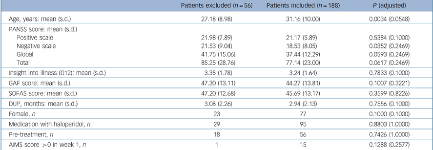 | Patients excluded (n = 56) | Patients included (n = 188) | P (adjusted) | |
