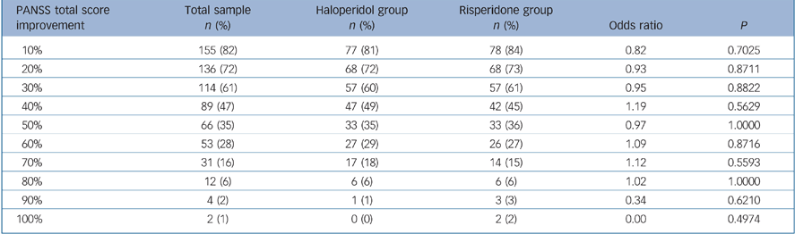 | PANSS total score improvement | Total sample n (%) | Haloperidol group n (%) | Risperidone group n (%) | Odds ratio | P |