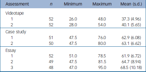 All 52 trainees across the two cohorts were examined on both videotape 1 and videotape 2. Of these trainees, 51 (98%) submitted case study 1, 50 (96%) submitted case study 2, all submitted essay 1, 49 (94%) submitted essay 2, and 48 (92%) submitted essay 3. Overall, 15 out of 104 (14%) videotapes received a mark from a third examiner. On all occasions, this replaced one of the scores assigned by the original pair of examiners. In addition, 15 out of 101 (15%) case studies received a third mark and similarly on all occasions an original examiner's score was substituted by the third mark. Of the 149 essays submitted by trainees, a third examiner assessed 25 (17%); on 24 out of 25 (96%) occasions the third examiner's marks replaced an original mark.