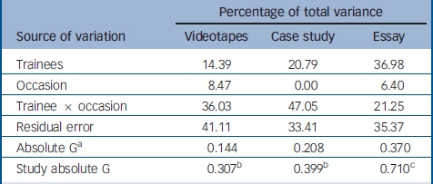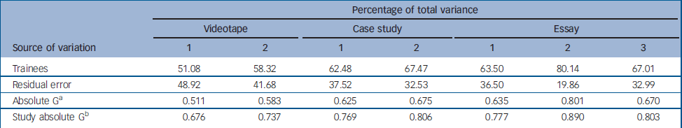 Generalisability theory was used to determine the magnitude of the sources of variation in, and the reliability of, all examinations (this is termed a G-study). Generalisability theory was also used to calculate the most effective ways of reducing measurement error and thereby achieving acceptable levels of generalisability (this is called a D-study). Generalisability theory (rather than classic test theory) was used because it is eminently suitable in those situations wherein the goal is to identify and quantify errors of measurement and in doing so find effective methods for reducing their influence. Reference Shavelson, Webb and Rowley7,Reference Streiner and Norman8 A generalisability coefficient of 0.8 or more is generally accepted as indicating adequate reliability, Reference Wass, van der Vleuten, Shatzer and Jones9 although some have suggested a coefficient of at least 0.9 in very high-stakes examinations, such as those relating to professional licensure. Reference Downing10 Generalisability analyses were conducted on trainees' total scores on the CTS–R, case studies and essays because it was at this level that examiners made pass/fail decisions.