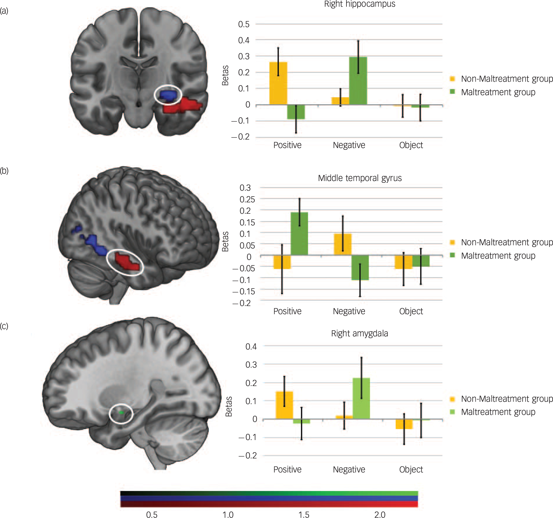 (a) whole-brain group analyses showing significantly reduced activation in the maltreated group relative to the non-maltreated group (controls) in response to the positive ABM recall v. negative ABM recall in the right hippocampus (blue) and (b) higher activation in the middle temporal gyrus (MTG; red), (c) Regions of interest analyses showing greater right amygdala activation (green) in response to negative ABM recall v. positive ABM recall (family-wise error-corrected), whole brain results were corrected at P = 0.005, cluster extent (ke) = 75 and parameter estimates represent differences in activation between positive and negative ABM recall. Error bars indicate one standard error of the mean (SEM).