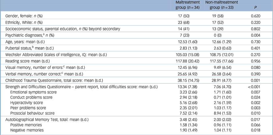 All the participants in the maltreatment group had experienced a level of maltreatment requiring social services referral. Severity of neglect, emotional, sexual and physical abuse as well as intimate partner violence, were rated by the child's social worker or adoptive parent on the basis of social services file information. Ratings from zero (not present) to four (severe) were applied to each category. Reference Kaufman, Jones, Stieglitz, Vitulano and Mannarino19 The majority of children had been exposed to neglect, emotional abuse and intimate partner violence (online Table DS1). In addition, children completed the Childhood Trauma Questionnaire (CTQ, Table 1 and see online Table DS2 for the scores on the subscales of the CTQ). Reference Bernstein, Stein, Newcomb, Walker, Pogge and Ahluvalia20