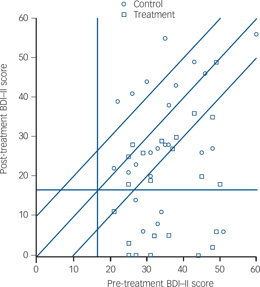 We used Jacobson & Truax Reference Jacobson and Truax27 procedures for calculating reliable and clinically significance change to quantify clinical improvement in depressive symptoms on the BDI–II; this is recommended as a standard reporting strategy for all published research involving psychological interventions. Reference Evans, Margison and Barkham28 This requires a pre- to post-treatment improvement in scores that is unlikely to be because of the inherent unreliability of the measure (reliable change) accompanied by a movement from a clinical range to a non-clinical one (clinically significant change). In calculating reliable and clinically significant change criteria, we used data from the BDI–II manual Reference Beck, Steer and Brown17 for clinical means, standard deviations and the reliability estimate (Cronbach's alpha), and data from Dozois et al Reference Dozois, Dobson and Ahnberg29 for the non-clinical mean and standard deviation. On the basis of these data, a participant had to improve by ten points or more from pre- to post-treatment to show reliable change and in addition had to score 17 or above pre-treatment and 16 or below post-treatment to meet criteria for clinically significant change (see Jacobson & Truax Reference Jacobson and Truax27 for details of calculations).