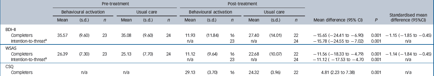 Intention-to-treat analysis with multiple imputation showed a mean difference on post-WSAS scores of –11.12 in favour of behavioural activation (95% CI –17.53 to –4.70, P = 0.001), with all randomised participants (behavioural activation group n = 23, usual care group n = 24) included in the analysis.