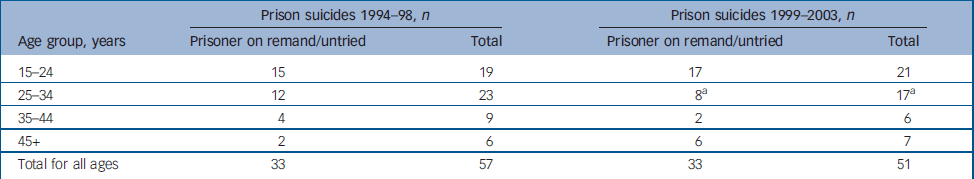Table 2 Observed suicides of males in Scottish prisons 1994–98 and 1999–2003 (those on remand/untried and total numbers)