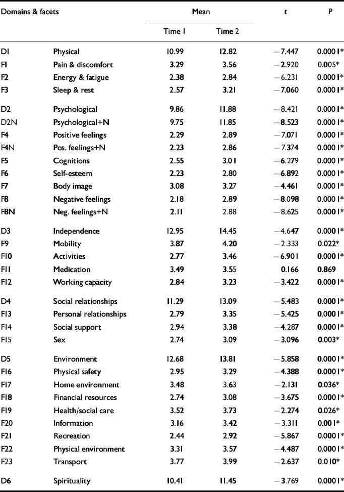 Table 2 Student's t-test (matched pairs) showing differences between test and retest for World Health Organization Quality of Life Assessment (100-item version) (WHOQOL-100) domains and facets