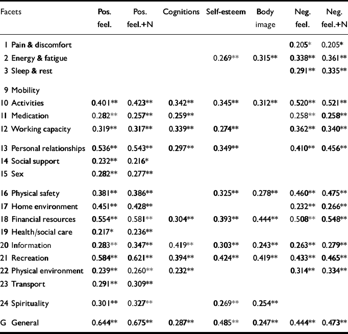 Two other results require comment. First, positive mood is not associated with any facets in the physical domain, suggesting that perceptions of physical state are evaluated independently from good mood. Second, some facets outside the psychological domain were significantly associated with all the facets of the psychological domain, notably activities of daily living, financial resources, information and skills, participation and recreation and leisure but also general health and overall quality of life. This result suggests that these ratings are affected by the state of mental health during completion. This has practical implications for the administration of the instrument and interpretation of scores.