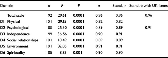 | Domain | n | F | P | α | Stand. α | Stand. α with UK items | |