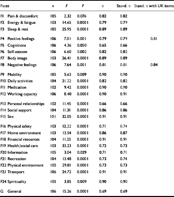 Cronbach's α (and standardised α) were calculated for the total scale of the WHOQOL-100 and obtained an excellent value of 0.96. When the six domains were similarly analysed, internal consistency reliability for independence, environment and spirituality exceeded 0.9, and the other three domains showed very good α values of 0.82-0.89 (Table 4). Six facets exceeded the 0.9 criterion that permits the individual interpretation of scores: mobility, working capacity, sex, finances, transport (to health care), and spirituality (religion and personal beliefs) (Table 5). Three facets showed marginally acceptable results — personal relationships, cognitions and general health — and so scores from these facets should be interpreted carefully. The inclusion of two national items marginally improves the internal consistency of the positive and negative feelings facets. Throughout the results, analyses have been conducted with and without national items to assess their contribution to the UK WHOQOL-100.