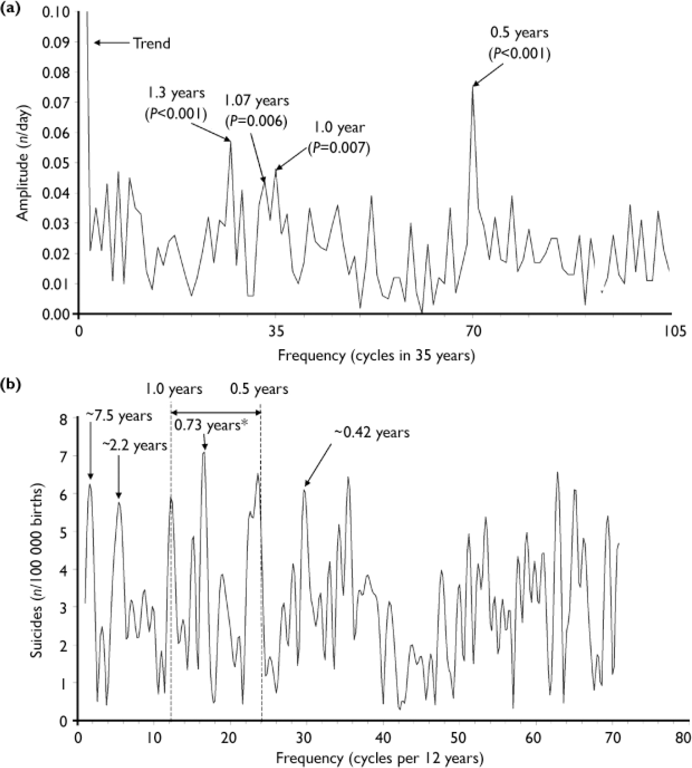 Fig. 1 (a) Suicides in Minnesota according to calendar date of death (1968–2002); (b) suicides in England and Wales according to calendar month of birth. *Validated non-linearly: period=0.727 years (95% CI 0.703–0.751). Data from Salib & Cortina-Borja (Reference Salib and Cortina-Borja2006).