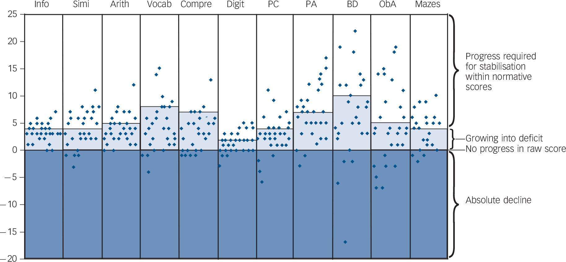 Among the group assessed with the WISC-III-NL at both 7.5 years and 9.5 years of age (n = 29) were children who obtained a lower absolute (raw) score at 9.5 years for the same series of questions or tasks that had been presented at age 7.5 years (Fig. 3). A lower raw score implies a decrease in performance where normally an increase would be expected due to ageing and maturation of the child. In a substantial subgroup of 10 children (34%), this absolute decline in abilities was observed for two or more subtests (online Table DS2). Furthermore, Fig. 3 shows clearly the area in which the children were growing into deficit: their raw scores were better than they were at age 7.5 years, but did not meet